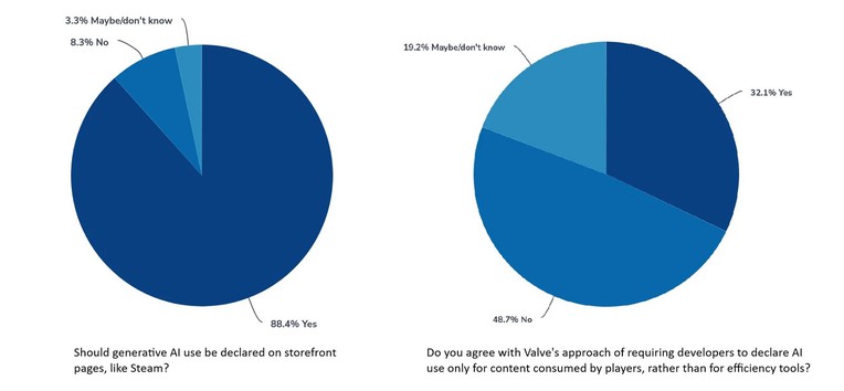 Kết quả khảo sát cho thấy 88,4% người tham gia đồng ý rằng nếu một trò chơi sử dụng GenAI, thông tin này cần được công khai trên trang bán game. Tuy nhiên, ý kiến về cách Valve triển khai quy định này lại phân hóa: 48,7% không đồng tình với cách làm của Valve, 32,1% ủng hộ, còn lại 19,2% chọn phương án chưa chắc chắn hoặc không biết.