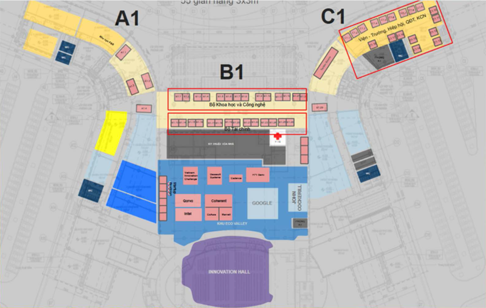 Sơ đồ Tầng 1 với 73 gian hàng. Khu A1 sẽ là nơi trưng bày của 30 startup tiêu biểu, khu B1 là nơi trưng bày của 20 doanh nghiệp, tập đoàn lớn, Viện/Trường tiêu biểu, khu C1 là nơi trưng bày của 20 Doanh nghiệp, Hiệp hội, Viện/Trường. Trong đó Khu đặc biệt là nơi trưng bày của 3 Doanh nghiệp lớn trong nước và quốc tế.