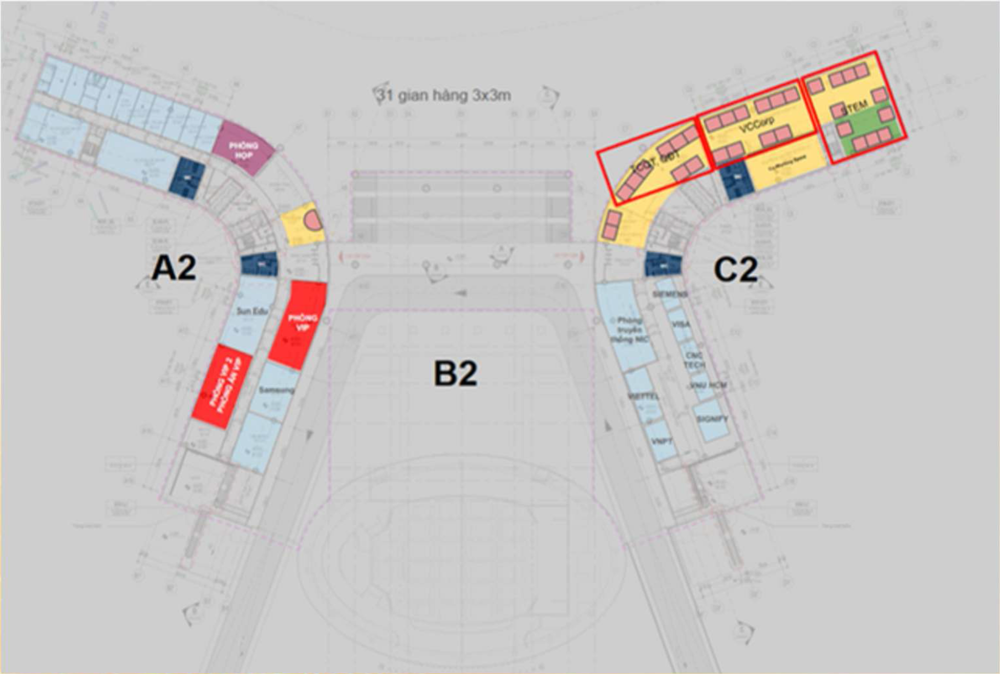 Sơ đồ tầng 2 với khu C2 là nơi trưng bày của 31 gian hàng tiêu chuẩn dành cho hoạt động STEM, và một số doanh nghiệp đổi mới sáng tạo các lĩnh vực tài chính ngân hàng, quỹ đầu tư. Ngoài ra đây cũng là nơi trưng bày của một số Hiệp hội công nghệ và gian hàng của một số quốc gia.