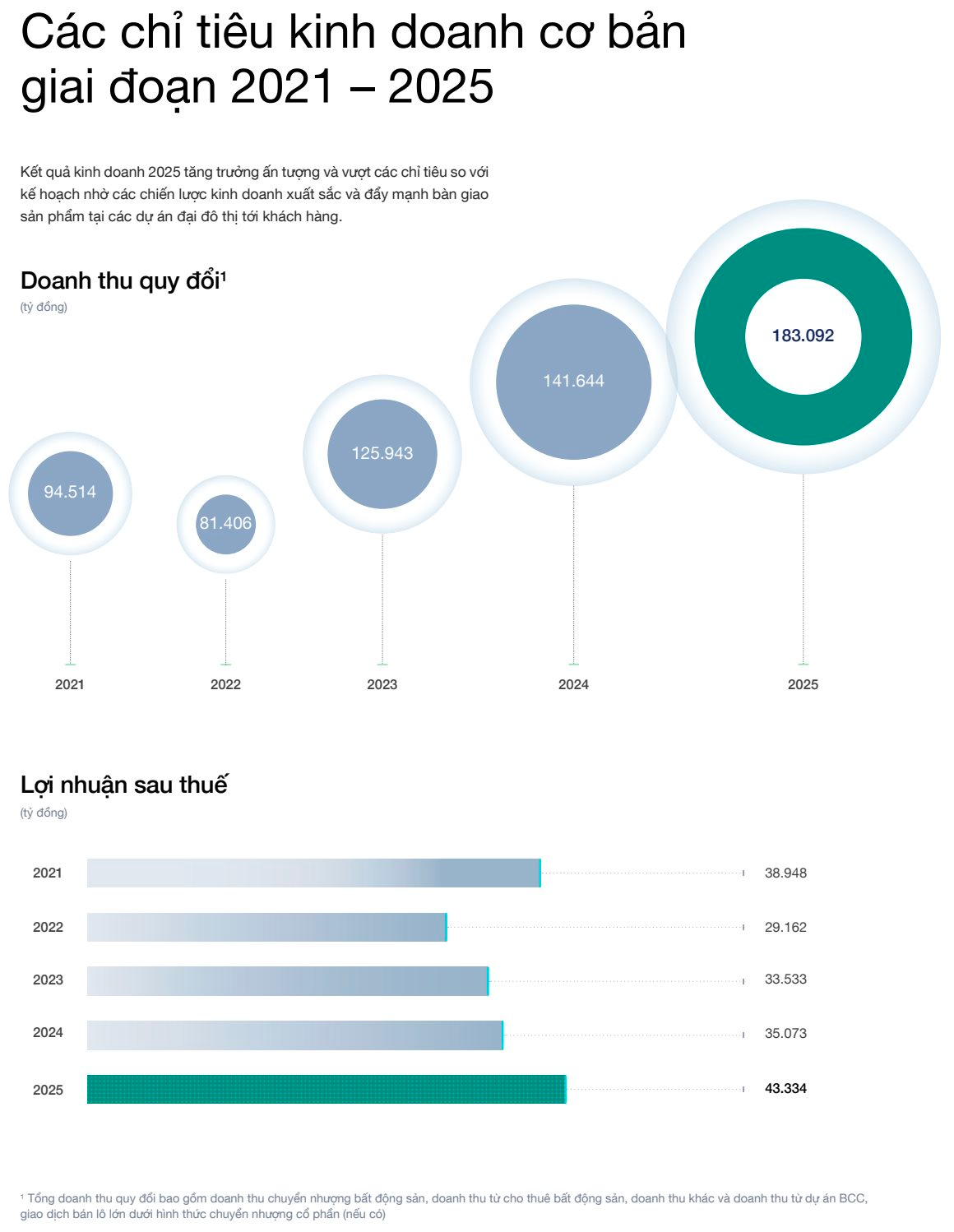Năm 2025, doanh thu thuần hợp nhất của Vinhomes đạt hơn 153.000 tỷ đồng, tăng 50% so với cùng kỳ. Trong đó, doanh thu từ hoạt động chuyển nhượng bất động sản tiếp tục là mảng kinh doanh cốt lõi, đạt hơn 108.000 tỷ đồng, chủ yếu nhờ bàn giao đúng tiến độ tại các đại dự án như Vinhomes Ocean Park 2, Vinhomes Ocean Park 3, Vinhomes Grand Park và Vinhomes Golden Avenue cùng một số dự án khác. Lợi nhuận sau thuế năm 2025 đạt hơn 43.000 tỷ đồng, tăng 23,6% so với năm 2024.