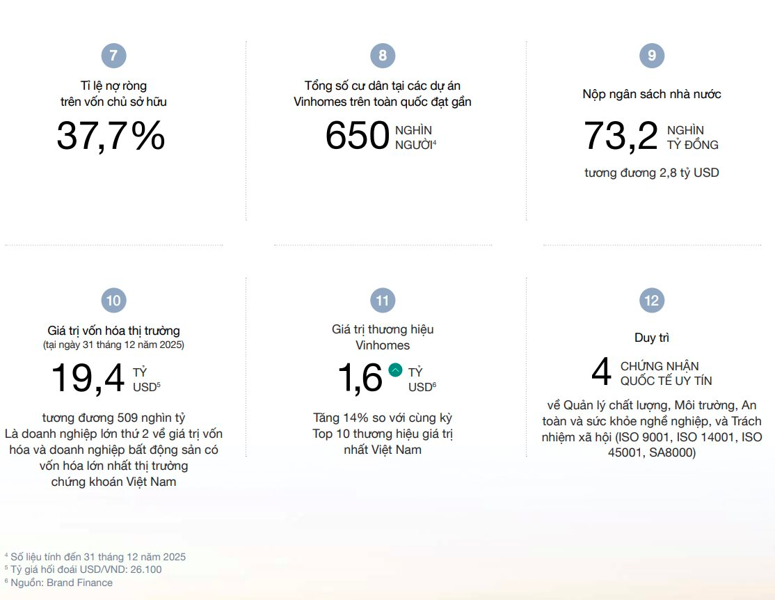 Công ty cổ phần Vinhomes (VHM) vừa công bố báo cáo thường niên 2025. Báo cáo cho biết, tính đến cuối năm 2025, tổng số cư dân tại các dự án Vinhomes trên toàn quốc đạt gần 650.000 người, tăng khoảng 157.000 người so với năm trước đó.