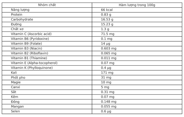 Theo thống kê từ Bộ Nông nghiệp Hoa Kỳ (USDA), trong 100g vải thiều tươi cung cấp các chất dinh dưỡng trong bảng sau: