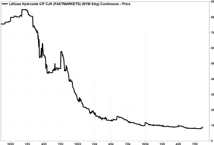 Giá lithium từ tháng 10/2022 đến 11/8/2025. Nguồn: Factset.