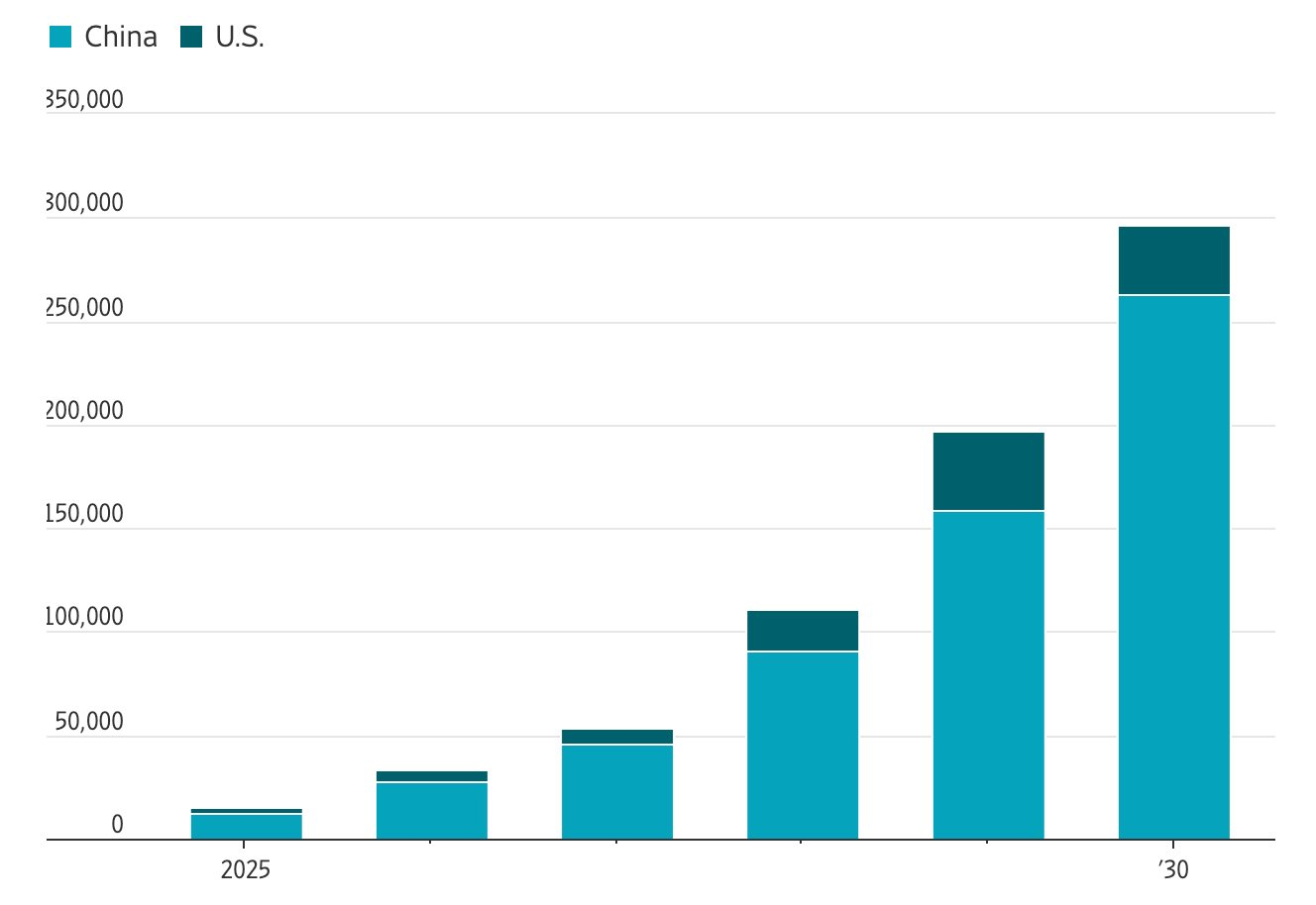 So sánh sản lượng tiêu thụ ước tính của robot hình người tại Trung Quốc và Mỹ