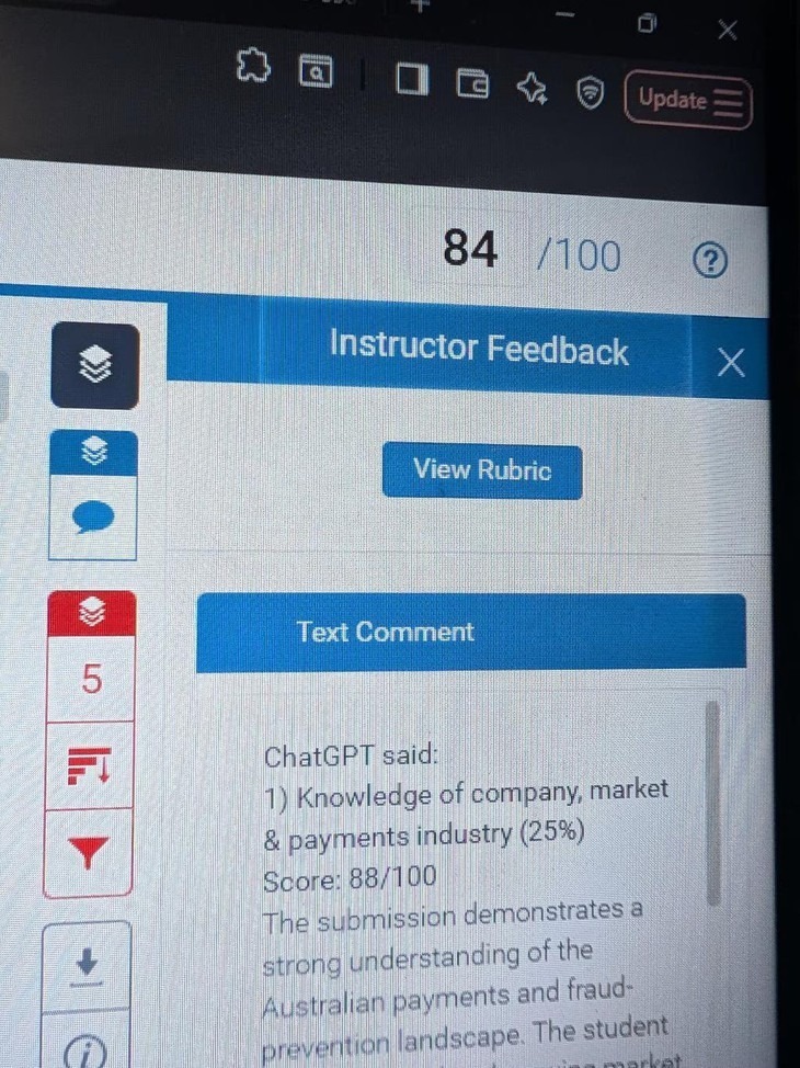 Hình ảnh cho thấy phản hồi của giảng viên được viết trong phần mềm chống đạo văn TurnItIn, với nội dung đáng chú ý: "ChatGPT cho biết: … bài nộp thể hiện sự hiểu biết sâu sắc về bối cảnh thanh toán và phòng chống gian lận của nước Úc" và chấm bài tập này 88/100 điểm.