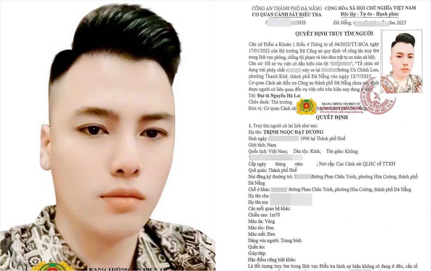Cơ quan Cảnh sát điều tra (Phòng Cảnh sát hình sự), Công an thành phố Đà Nẵng vừa ra quyết định truy tìm Trịnh Ngọc Đạt Dương (SN 1996, trú phường Hòa Cường, TP Đà Nẵng) để phục vụ công tác điều tra vụ án “Hiếp dâm” và “Tổ chức sử dụng trái phép chất ma túy” xảy ra rạng sáng 12/7/2025.