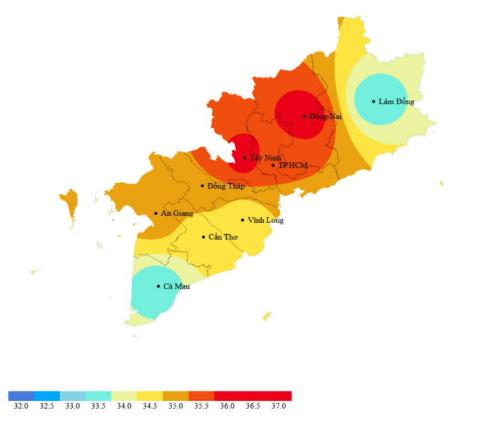Bản đồ dự báo nhiệt độ cao nhất trong 24 giờ tới. (Nguồn: Đài Khí tượng Thủy văn Nam Bộ)