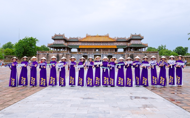Áo dài tím truyền thống nổi bật tại Đại Nội Huế hưởng ứng chiến dịch 2.222 nhà thuốc Long Châu.