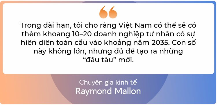 Về dài hạn, tôi cho rằng đến khoảng năm 2035, Việt Nam có thể có khoảng 10–20 doanh nghiệp tư nhân có sự hiện diện trên phạm vi toàn cầu. Con số này không lớn, nhưng đủ để tạo ra những “người chơi dẫn dắt” mới. Những doanh nghiệp như FPT và Vingroup có thể tiếp tục mở rộng ra quốc tế, trong khi một số doanh nghiệp khác sẽ tập trung nhiều hơn vào thị trường trong nước.