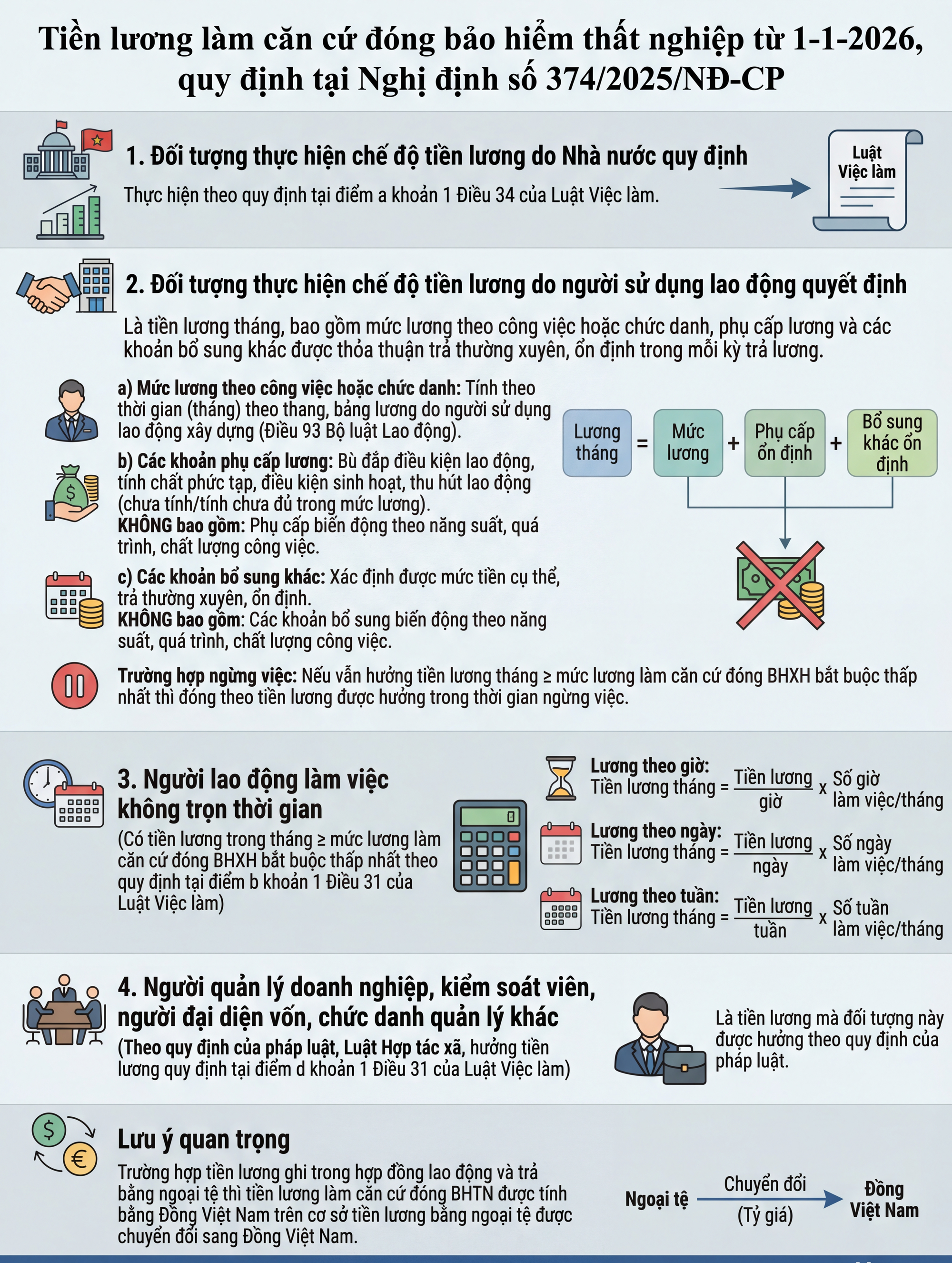 Nghị định 374/2025/NĐ-CP đã quy định về mức tiền lương làm căn cứ đóng BHTN, bao gồm cả người làm việc không trọn thời gian, quản lý doanh nghiệp