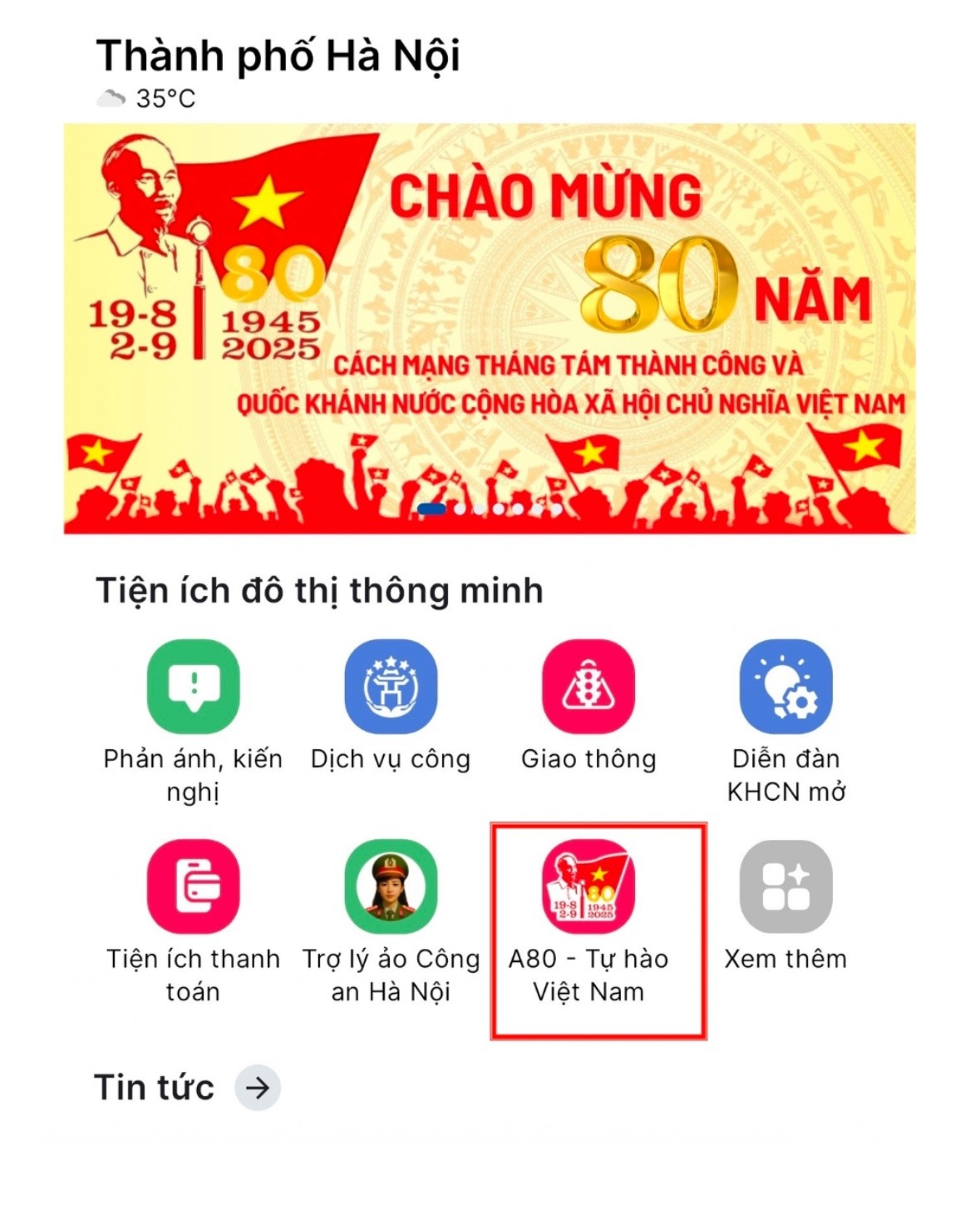 Hướng tới kỷ niệm 80 năm Cách mạng tháng Tám thành công (19/8/1945 - 19/8/2025) và Quốc khánh 2/9 (2/9/1945 - 2/9/2025), thành phố Hà Nội chính thức ra mắt nền tảng số "A80 - Tự hào Việt Nam" có cổng thông tin điện tử tại địa chỉ https://a80.hanoi.gov.vn và đã được tích hợp trên ứng dụng iHanoi.