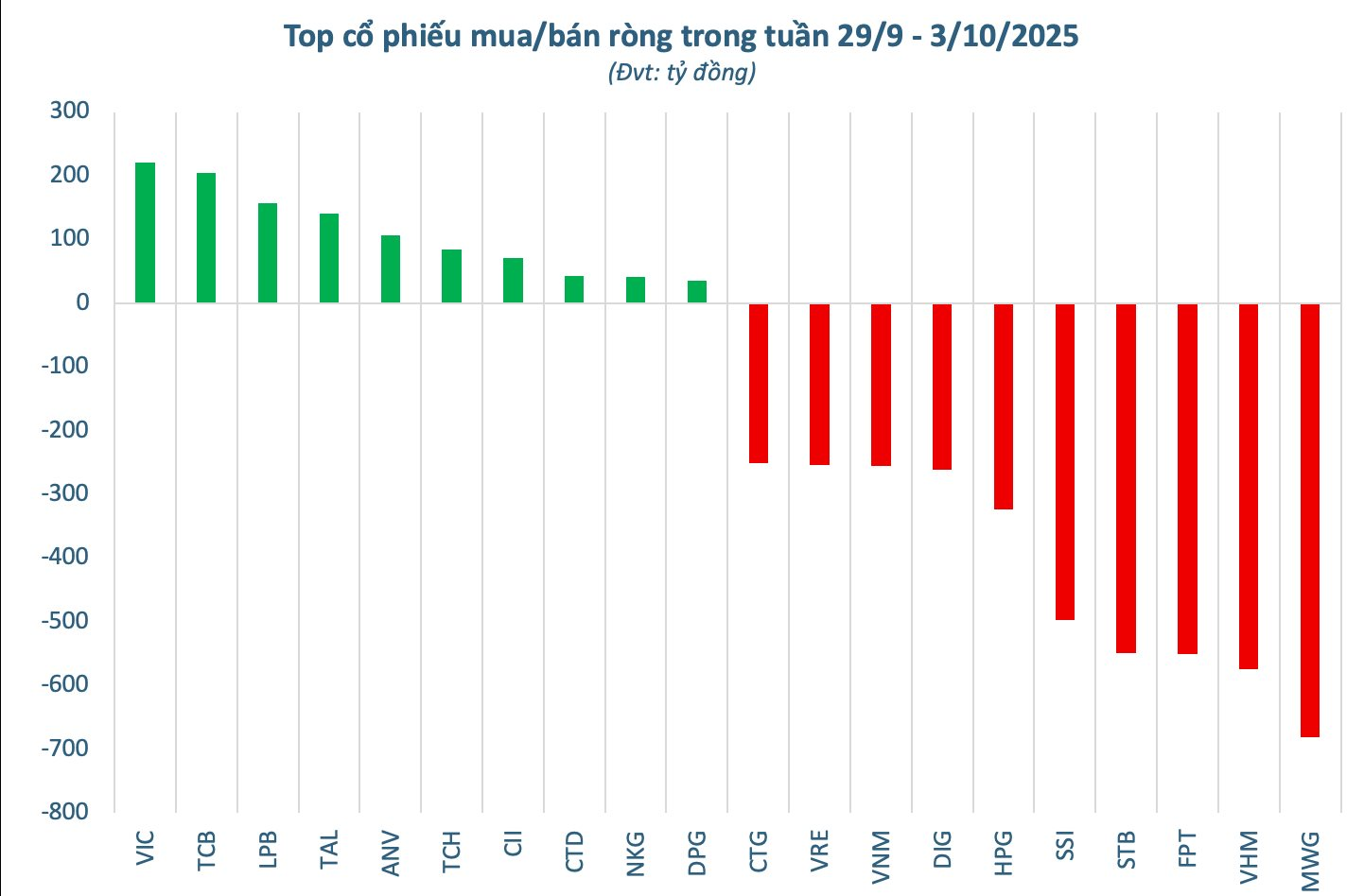 Thống kê theo các mã chứng khoán, trong tuần giao dịch vừa qua, MWG là tâm điểm bị bán ròng mạnh nhất với giá trị 681 tỷ đồng, bỏ xa các mã còn lại. VHM đứng thứ hai với mức bán ròng 573,3 tỷ đồng, tiếp đến là FPT (550,1 tỷ đồng) và STB (548,5 tỷ đồng). Nhiều cổ phiếu vốn hóa lớn khác cũng chịu áp lực rút vốn như SSI (496,3 tỷ đồng), HPG (323,3 tỷ đồng), DIG (260,7 tỷ đồng) và VNM (255,5 tỷ đồng). Các mã VRE, CTG, MSN và SHB ghi nhận mức bán ròng dao động từ 217 đến 253 tỷ đồng tại mỗi mã.