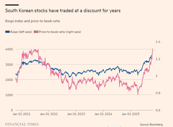 Chưa bao giờ thị trường chứng khoán Hàn Quốc lại thu hút sự chú ý của giới đầu tư toàn cầu như năm 2025. Chỉ trong mười tháng, chỉ số Kospi đã tăng hơn 66%, trở thành chỉ số chứng khoán có hiệu suất tốt nhất thế giới, bỏ xa S&P 500 của Mỹ tới gần 50 điểm phần trăm, mức chênh lệch chưa từng thấy trong hai thập kỷ.