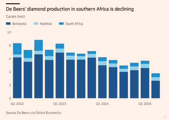 Tuy nhiên, câu chuyện cổ tích đã phải đối mặt với một thực tại khắc nghiệt. Thị trường kim cương tự nhiên đang sụp đổ, kéo theo nền kinh tế Botswana vào một cuộc khủng hoảng nghiêm trọng. Các số liệu gần đây vẽ nên một bức tranh ảm đạm với tăng trưởng GDP của Botswana giảm 3% vào năm 2024, một trong những mức giảm tồi tệ nhất ở châu Phi, và dự báo tiếp tục giảm 0,8% năm 2025, qua đó bước vào suy thoái kỹ thuật.