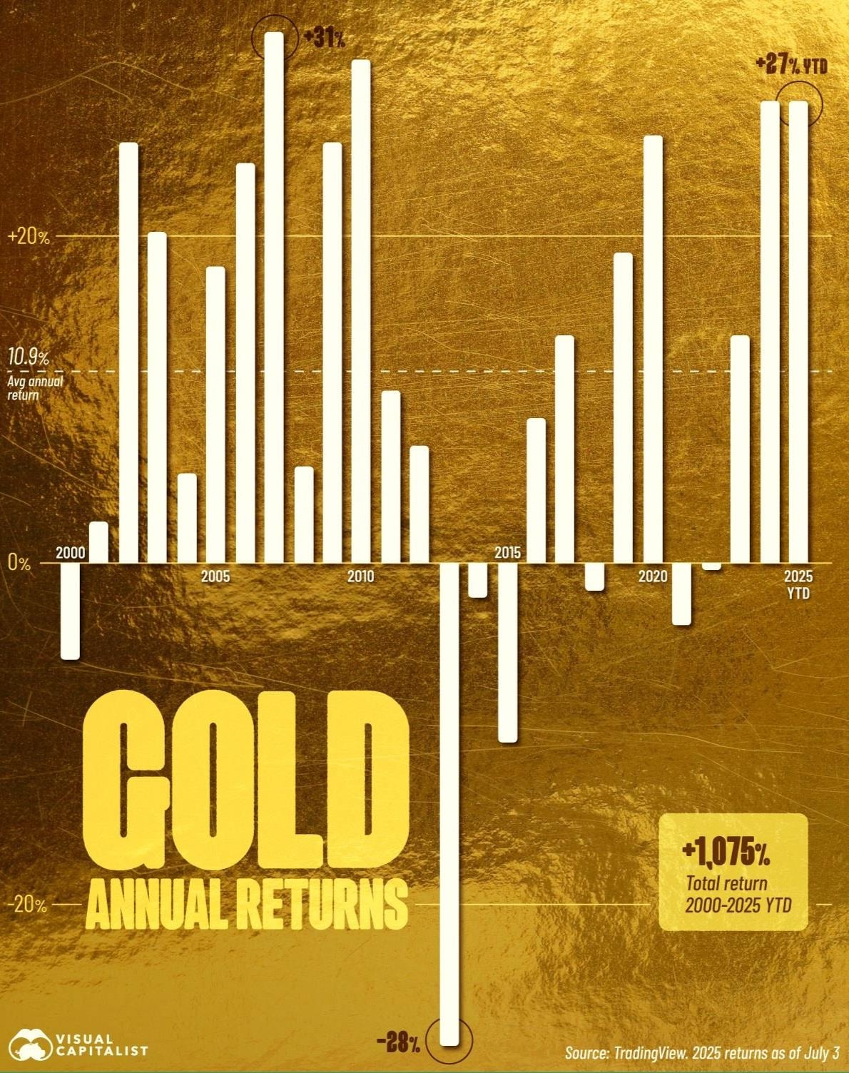 Từ năm 2000 đến 2025, vàng tăng mạnh tới 1.075%, với lợi suất trung bình hàng năm khoảng 10,9%.