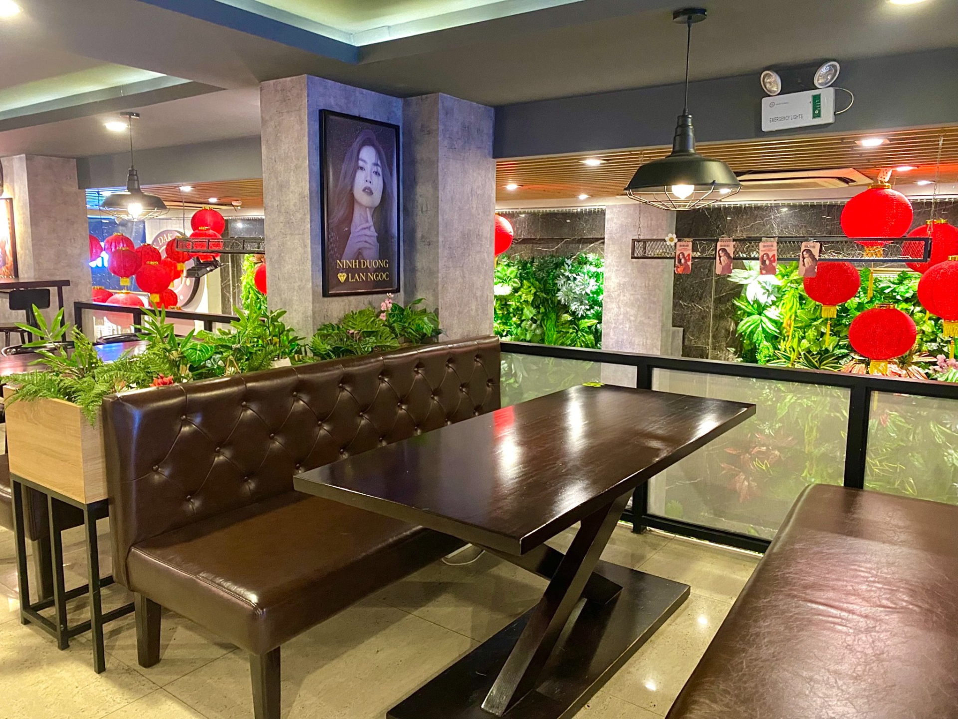 Quán Sik Dak Fook Coffee & Tea được thiết kế theo phong cách hiện đại, tối giản với tone đen - xám chủ đạo, chia thành nhiều khu vực phục vụ cà phê, ăn uống và cả buffet. Diện tích không quá lớn nhưng vẫn đủ tạo cảm giác thoải mái. Một điểm dễ nhận ra là không gian bên trong trưng bày khá nhiều hình ảnh của chính Lan Ngọc, đúng chuẩn “fan meeting phiên bản cà phê”.