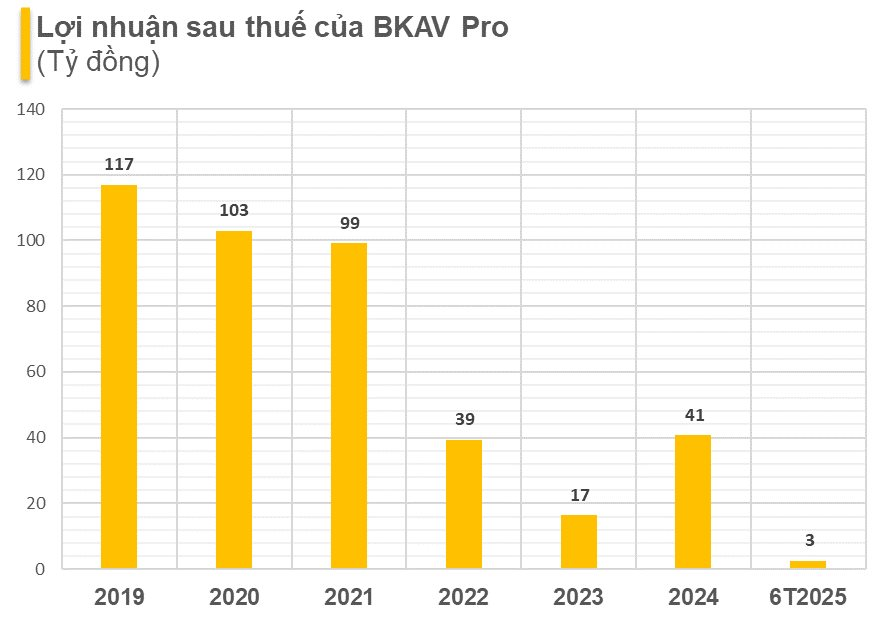 Lợi nhuận của Bkav Pro đã giảm liên tiếp từ 2019 - 2023, so với con số 117 tỷ đồng trong năm 2019, đến năm 2023 lợi nhuận Công ty chỉ còn 1/10 sau 4 năm. Năm 2024, lợi nhuận của công ty có sự cải thiện đạt 41 tỷ đồng, cao nhất trong vòng 3 năm.