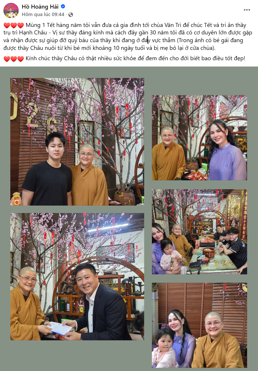 Trên trang cá nhân, doanh nhân Hồ Hoàng Hải - Chủ tịch HĐQT Công ty Cổ phần Phú Thành vừa chia sẻ khoảnh khắc anh và gia đình đến thăm, chúc Tết Sư thầy Hạnh Châu (trụ trì chùa Văn Trì, Bắc Từ Liêm, Hà Nội).