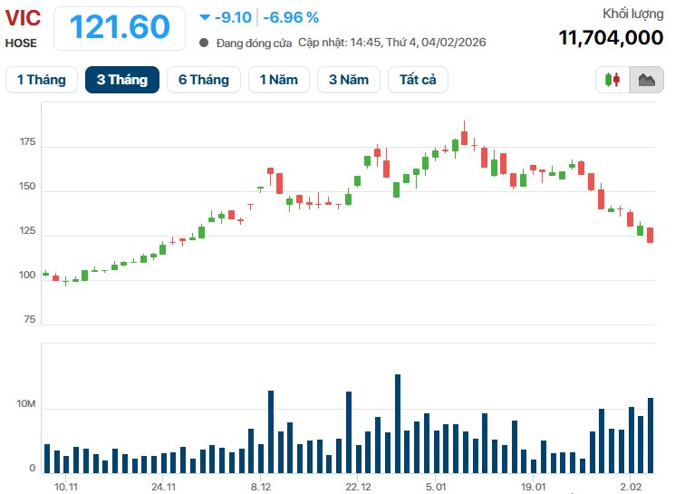 Cổ phiếu VIC bắt đầu vào đà giảm giá từ đầu tháng 1/2026, tính từ đầu năm tới nay, cổ phiếu VIC đã giảm hơn 28% giá trị.