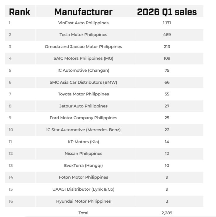 VinFast dẫn đầu bảng xếp hạng doanh số bán xe BEV tại Philippines quý 1/2026.