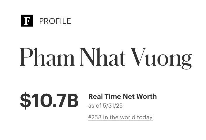 Còn theo cập nhật mới nhất trên Forbes, ông Phạm Nhật Vượng có khối tài sản lên đến 10,7 tỷ USD, đứng thứ 258 trong danh sách tỷ phú thế giới. Trong thời gian cổ phiếu VIC tăng chóng mặt, Chủ tịch Vingroup đã vượt qua nhiều tỷ phú nổi tiếng thế giới trên bảng xếp hạng Forbes, có thể kể đến Tổng thống Mỹ Donald Trump, Chủ tịch Samsung Lee Jae-yong, Nhà sáng lập ra Thai Beverage, Chủ tịch TCC Group Charoen Sirivadhanabhakdi…