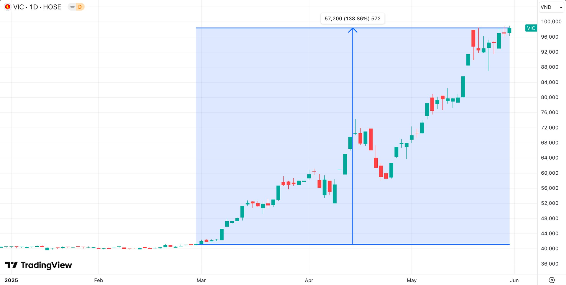 Nổi sóng từ đầu tháng 3, cổ phiếu Vingroup (mã VIC) tăng gần 140% chỉ sau 3 tháng, qua đó leo lên đỉnh 3 năm. Vốn hóa thị trường đạt gần 380.000 tỷ đồng (~15 tỷ USD), chỉ kém duy nhất Vietcombank tính trên toàn sàn chứng khoán. Trong khoảng thời gian cổ phiếu VIC nổi sóng, tỷ phú Phạm Nhật Vượng đã làm được rất nhiều việc quan trọng.