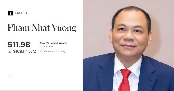 Giá trị cổ phiếu trên sàn của tỷ phú Phạm Nhật Vượng tăng thêm gần 14.000 tỷ lên 256.000 tỷ đồng. Còn theo bảng xếp hạng thời gian thực của Forbes, tài sản của ông Vượng đã lên 11,9 tỷ USD.