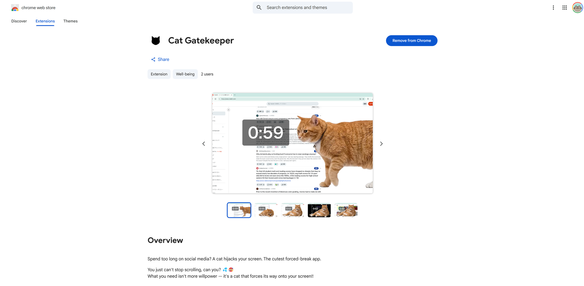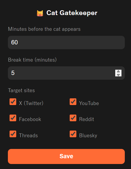 Cách sử dụng khá đơn giản. Người dùng chỉ cần thiết lập thời gian lướt mạng xã hội (mặc định 60 phút) và thời gian nghỉ (mặc định 5 phút). Khi hết giờ, mèo sẽ “chiếm chỗ”, kèm theo bộ đếm ngược cho đến khi bạn có thể tiếp tục sử dụng. Không có cách tắt nhanh hay lách luật, nên việc nghỉ là gần như bắt buộc.