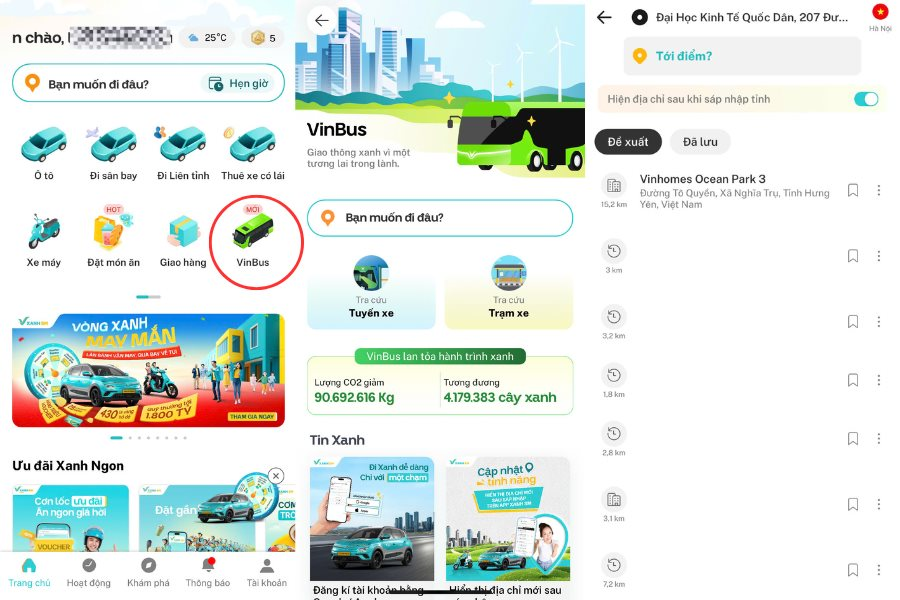 Tại đây, người dùng có thể sử dụng các tính năng như tìm kiếm, xem lịch trình các tuyến VinBus; theo dõi hành trình thực tế của xe buýt theo thời gian thực (real-time tracking); tìm trạm, tuyến và chỉ đường tới trạm trên bản đồ; theo dõi Chỉ số Cây xanh của VinBus.