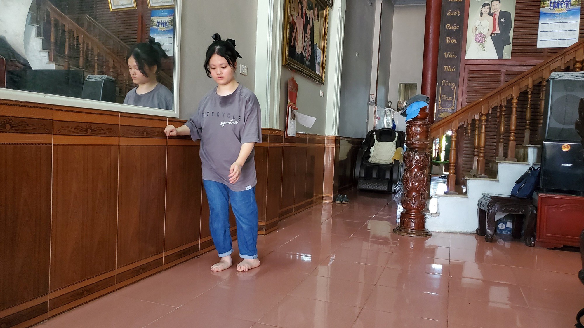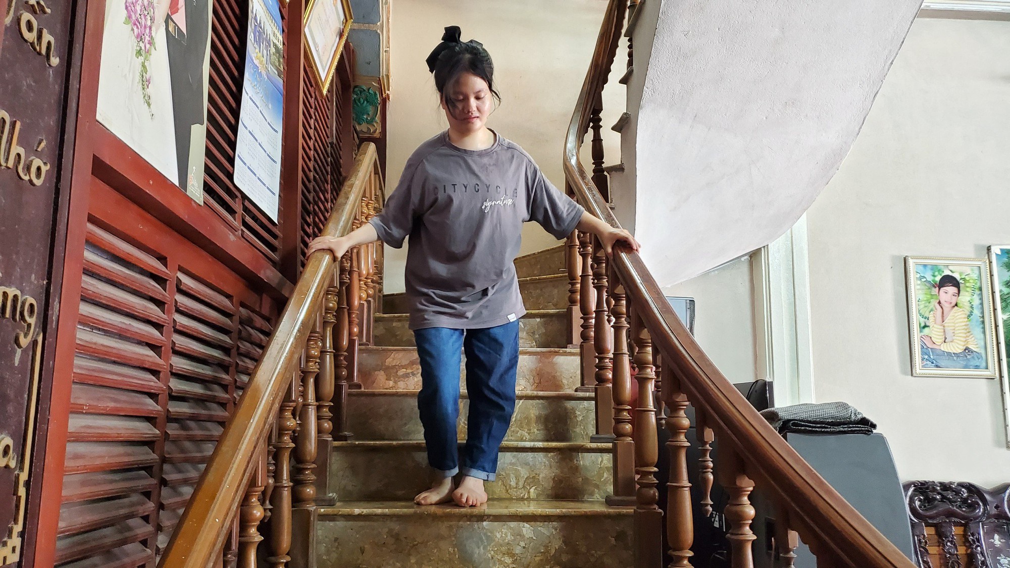 Liên đi từng bước khó nhọc trong căn nhà của mình