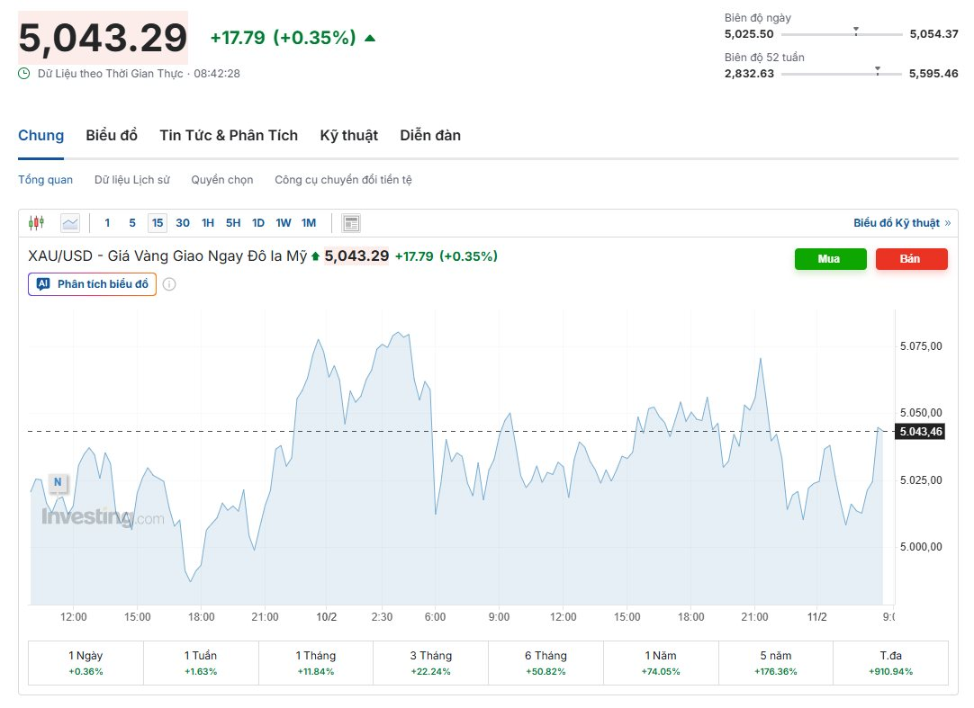 Theo dữ liệu cập nhật từ Kitco rạng sáng ngày 11/02/2026 (giờ Việt Nam), giá vàng giao ngay niêm yết ở mức 5.024,56 USD/ounce, giảm khoảng 0,61% (tương đương hơn 30 USD/ounce) so với phiên giao dịch trước đó. Trước đó, trong phiên đêm qua, có thời điểm vàng đã chạm tới vùng 5.072 USD/ounce nhưng không giữ được nhiệt trước áp lực chốt lời ngắn hạn.