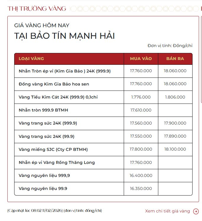 Cụ thể, cập nhật đến sáng ngày 11/02/2026, giá vàng miếng SJC tại Bảo Tín Mạnh Hải đã chính thức chạm ngưỡng 181 triệu đồng/lượng ở chiều bán ra, tăng khoảng 600.000 đồng so với phiên trước đó. Ở chiều mua vào, mức giá niêm yết xoay quanh 178 triệu đồng/lượng.