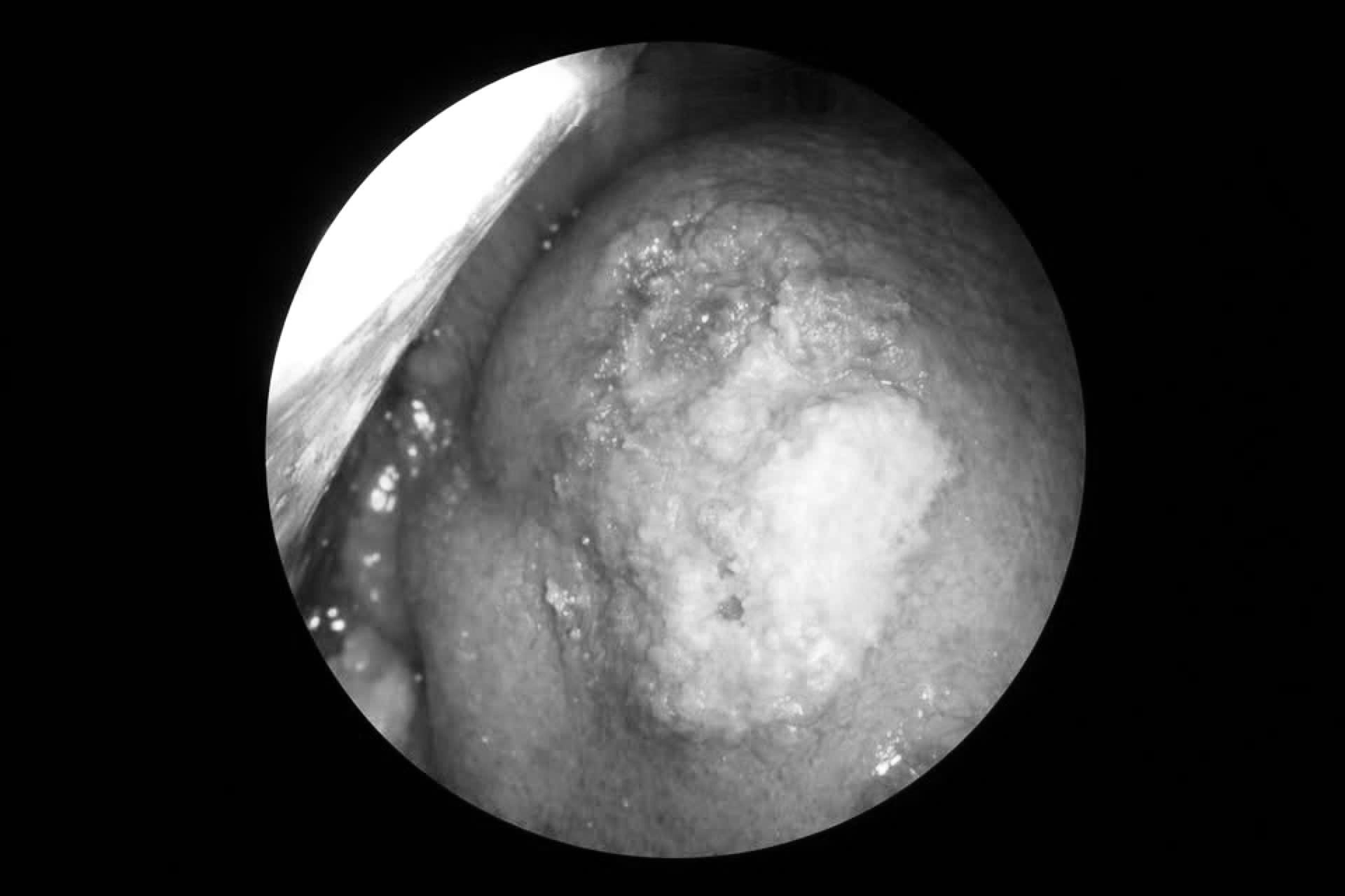 Tại Khoa Ung bướu, Bệnh viện Thanh Nhàn (Hà Nội), qua thăm khám, bác sĩ ghi nhận nhiều dấu hiệu nghi ngờ u ác tính và chỉ định sinh thiết lại. Kết quả xác định bệnh nhân mắc ung thư biểu mô vảy lưỡi - thể ung thư phổ biến nhất ở khoang miệng. Các xét nghiệm đánh giá giai đoạn gồm siêu âm và MRI, chưa ghi nhận di căn hạch cổ hay di căn xa.