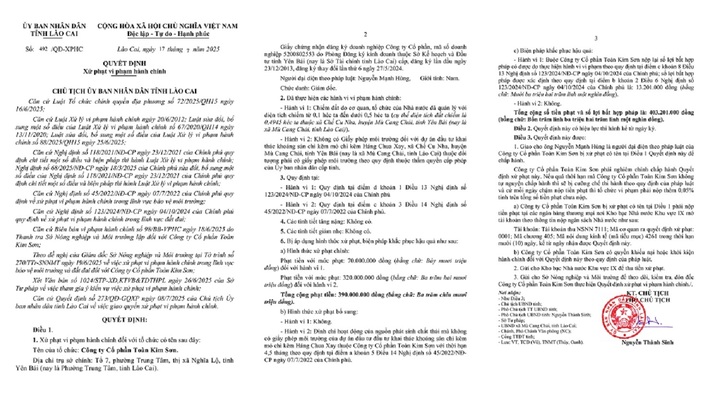 Thông tin từ UBND tỉnh Lào Cai, đơn vị này vừa ban hành quyết định xử phạt Công ty Cổ phần Toàn Kim Sơn (địa chỉ tại tổ 7, Trung Tâm, Nghĩa Lộ, Yên Bái nay là phường Trung Tâm, Lào Cai) 403,2 triệu đồng vì chiếm đất do cơ quan, tổ chức của Nhà nước đã quản lý và không có Giấy phép môi trường.