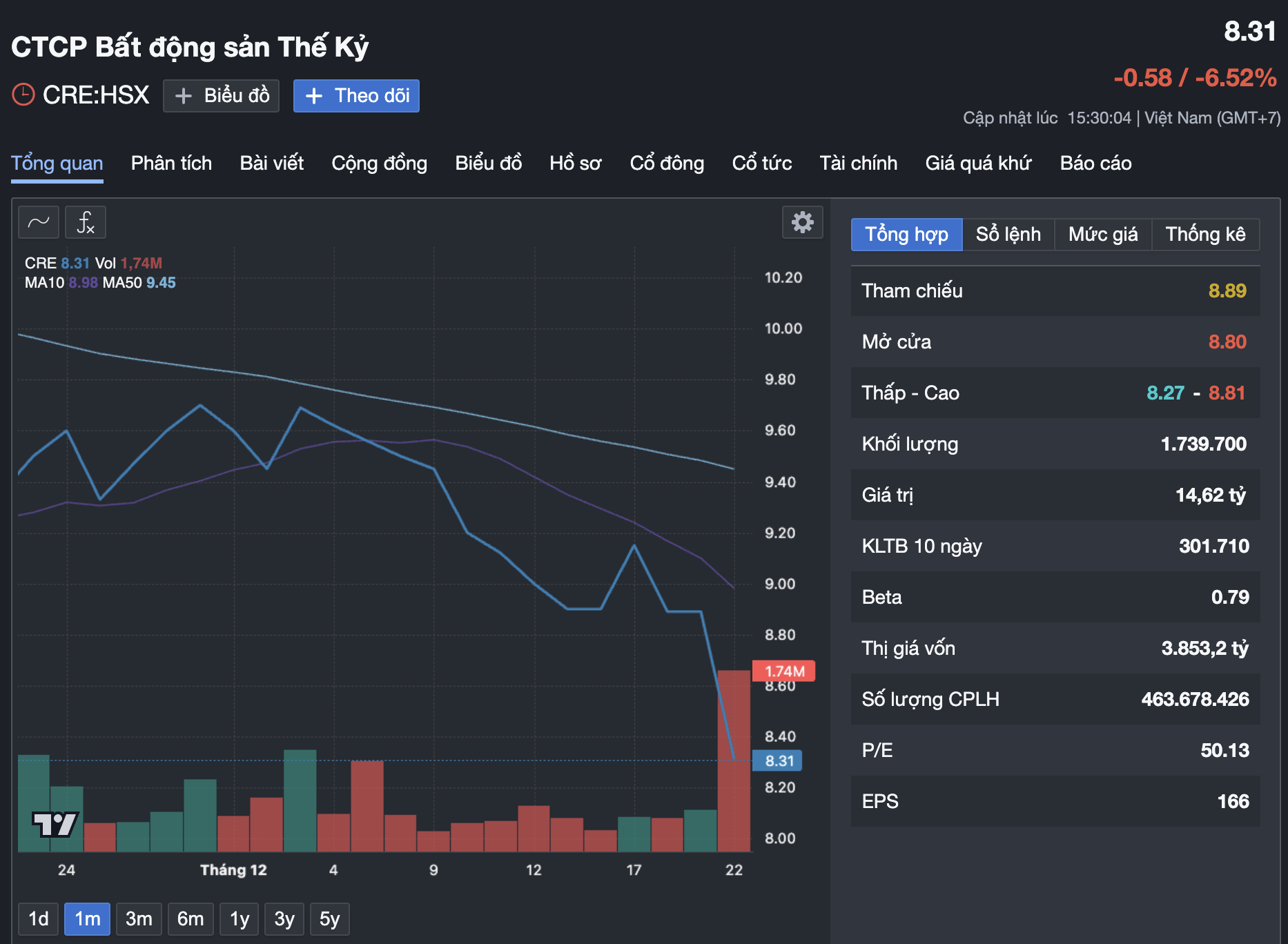 CRE đang ở mức 8.310 đồng/cổ phiếu, giảm 6,52% và có thời điểm chạm giá sàn trong phiên. Thanh khoản đạt 1,7 triệu đơn vị, gấp hơn 5 lần các phiên liền trước. So với đầu tháng 12-2025, cổ phiếu này đã mất hơn 14% giá trị.