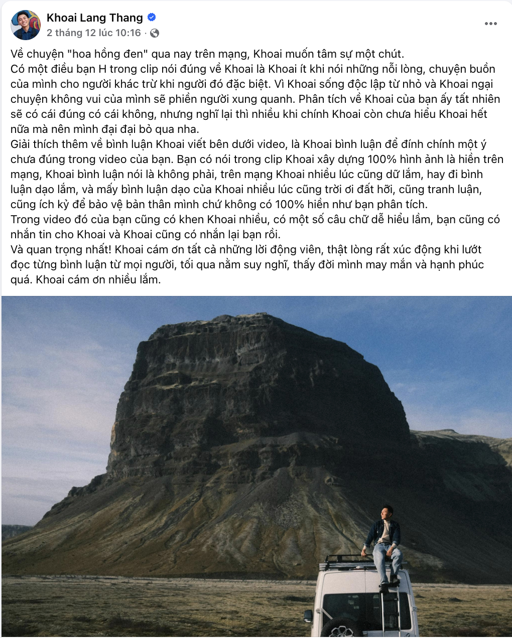 Tuy nhiên, mới đây, Khoai Lang Thang bất ngờ vướng vào một ồn ào xoay quanh khái niệm hoa hồng đen. Cụ thể, một người dùng TikTok đã đăng tải video phân tích về nhân chủng học của anh, từ đó đưa ra nhiều nhận xét liên quan đến tính cách của nam YouTuber và cho rằng anh thuộc kiểu người có EQ cao hơn IQ: “IQ vừa đủ xài nên bạn này biết được mình cần nói gì để giữ được phong thái mộc mạc, bình dị, đời thường, chân thành mà rất cuốn hút”. Những chia sẻ mang tính suy đoán cá nhân này đã nhanh chóng lan truyền trên mạng xã hội, kéo theo nhiều luồng ý kiến trái chiều.