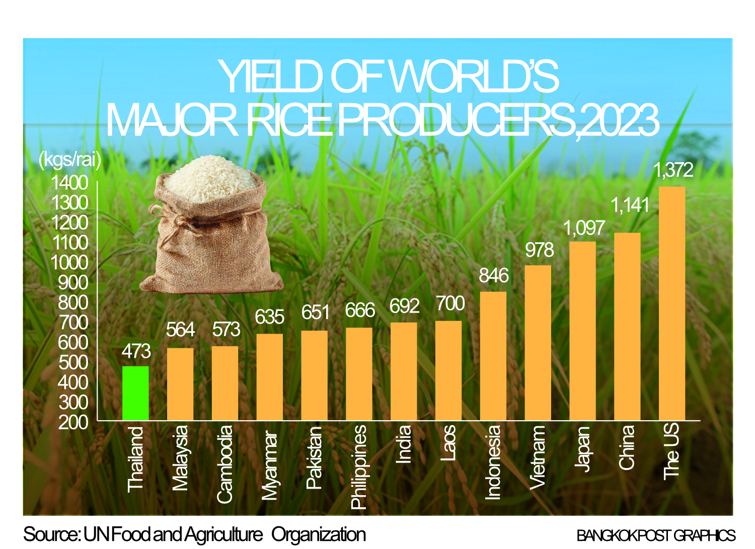 Theo Tổ chức Lương thực và Nông nghiệp Liên hợp quốc (FAO), năng suất lúa trung bình của Thái Lan là 473 kg/rai, trong khi năng suất của Việt Nam là 978 kg/rai và của Ấn Độ là 692 kg/rai.