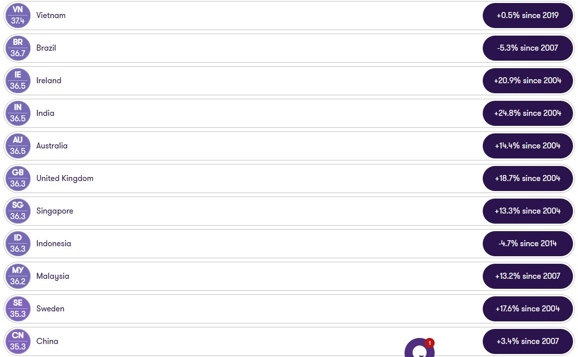 Tỷ lệ này cao hơn mức trung bình toàn cầu là 34% và dẫn trước nhiều khu vực kinh tế lớn như Nam Mỹ, châu Phi, châu Âu và Bắc Mỹ. Mỹ và Canada cũng "xếp sau" với tỷ lệ 34% và 34,7%.