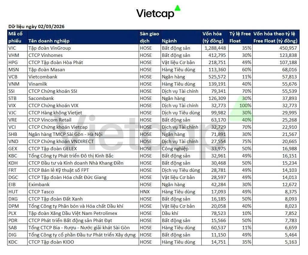 Dựa trên bảng số liệu ngày 2/3/2026 do Vietcap tổng hợp, sự phân hóa dòng vốn sẽ tập trung vào nhóm bất động sản, vật liệu cơ bản và tài chính thuộc danh sách 28 mã cổ phiếu đủ điều kiện sơ bộ. Tập đoàn Vingroup (VIC) đang có quy mô vốn hóa theo tỷ lệ tự do chuyển nhượng lớn nhất thị trường, đạt 450.957 tỷ đồng. Nguồn vốn mô phỏng chỉ số sẽ tiếp tục phân bổ vào Vinhomes (VHM) với mức vốn hóa free float 123.838 tỷ đồng và Tập đoàn Hòa Phát (HPG) đạt 107.188 tỷ đồng.