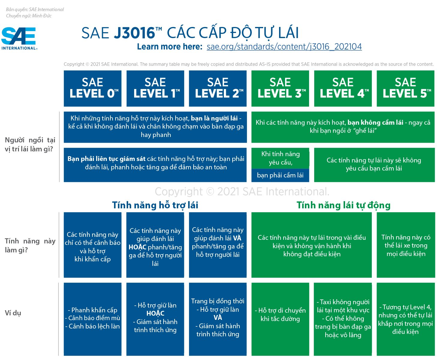Theo phân cấp của Hiệp hội Kỹ thuật Ô tô ( SAE - Society of Automotive Engineers), xe tự hành có 5 cấp độ, trong đó cấp 5 là cao nhất; xe đạt cấp 5 có thể tự động vận hành, tự lái ở mọi nơi trong mọi điều kiện.