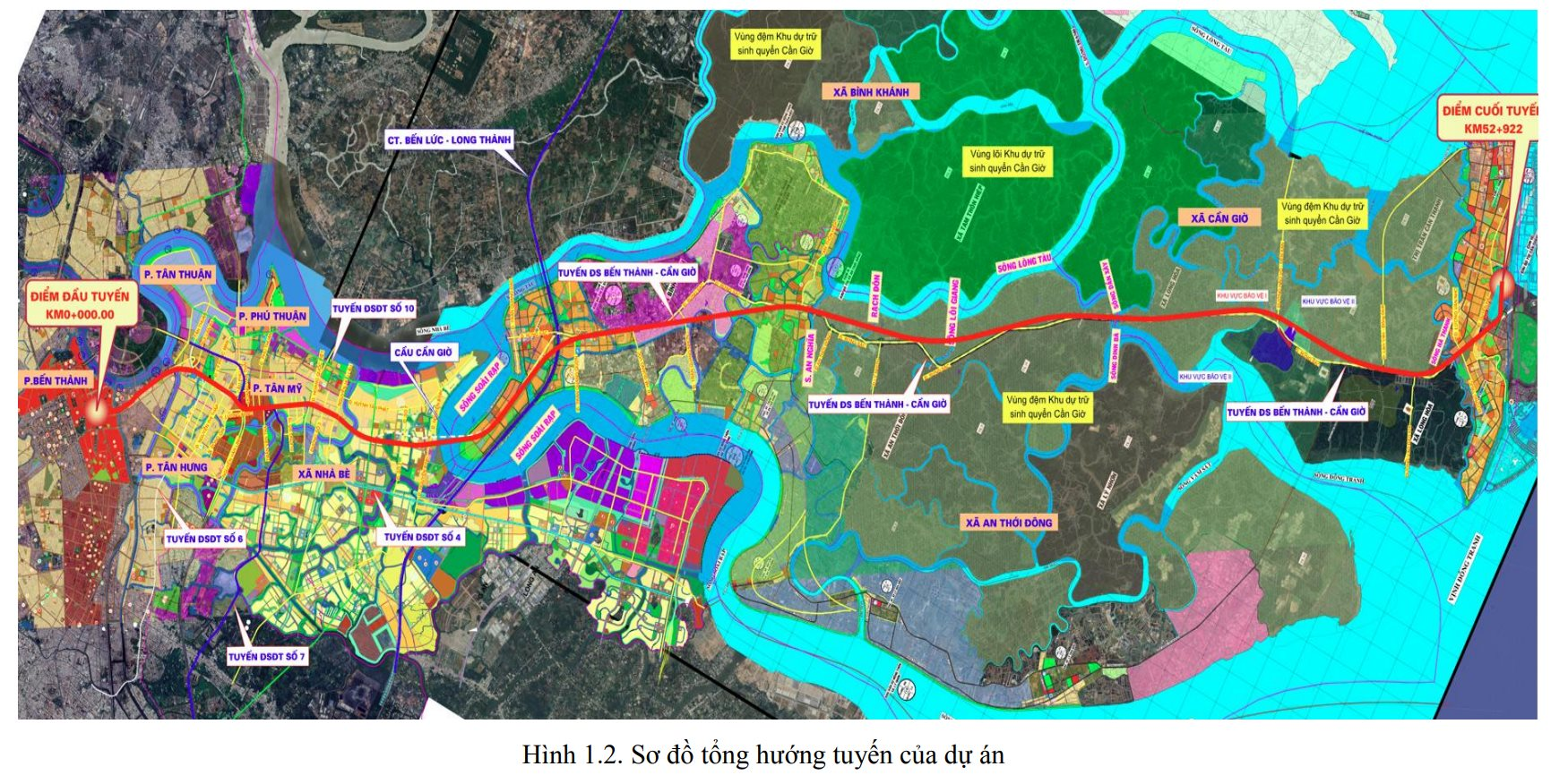 Bến cuối là địa phận xã Cần Giờ tại Km37+717 hướng tuyến bám theo đường Rừng Sác đến cuối đường tại nút giao với đường Duyên Hải khoảng Km51+000 rồi tiếp tục đi thẳng về cuối tuyến tại Km 52+922 thuộc KĐT Cần Giờ, xã Cần Giờ. Hướng tuyến lựa chọn đi qua vùng đệm khu dự trữ sinh quyển Cần Giờ (không đi vào vùng lõi). Đoạn tuyến Km44+00 tuyến đi về phía Đông tránh ranh giới khu vực bảo vệ rừng loại I.
