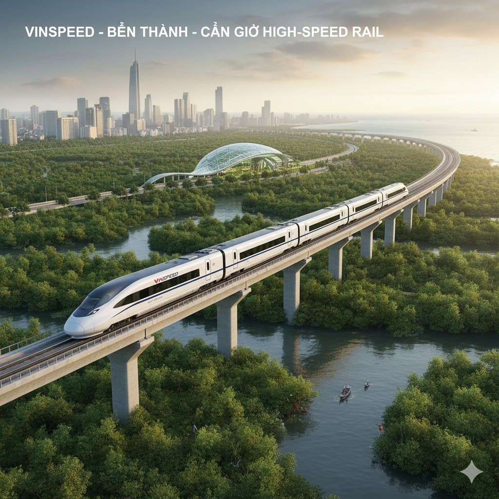 VinSpeed thuộc hệ sinh thái Vingroup vừa có đề xuất tuyến đường sắt Bến Thành-Cần Giờ với tốc độ tối đa lên tới 350 km/h, có thể di chuyển từ bến đầu đến cuối trong 20,3 phút.