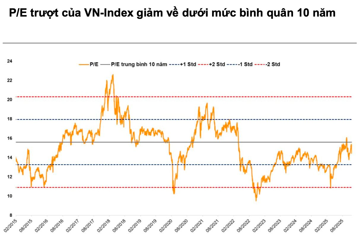 Định giá thị trường càng trở nên hấp dẫn hơn khi so sánh với mặt bằng lãi suất huy động. Hiện tỷ suất thu nhập trên giá (E/P) của VN-Index đạt khoảng 6,6%, trong khi lãi suất tiền gửi kỳ hạn 12 tháng chỉ quanh mức 5%/năm. Chênh lệch này cho thấy kênh chứng khoán vẫn duy trì sức hấp dẫn so với kênh tiết kiệm.
