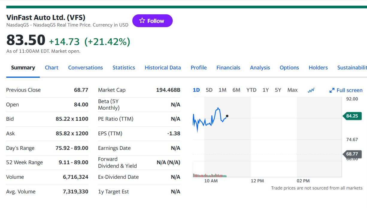 Tiếp đà hưng phấn, cổ phiếu VFS của VinFast vẫn giữ được mức tăng mạnh trong phiên giao dịch đầu tuần. Theo đó, tính đến 22h Việt Nam, cổ phiếu VFS đã tăng 21,41% lên 83,5 USD/cp. Với mức giá này, vốn hóa của VinFast hiện đang đạt gần 193 tỷ USD, đang tiến gần hơn đến mức vốn hóa của Toyota (225 tỷ USD).