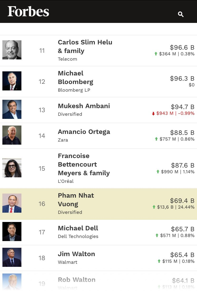 Hiện tại, Chủ tịch Vingroup đang đứng ở hạng 16 người giàu nhất hành tinh và đồng thời đã vượt qua tỷ phú Chung Thiểm Thiểm - người giàu nhất Trung Quốc đang có khối tài sản 60,5 tỷ USD để trở thành người giàu thứ 2 châu Á sau tỷ phú Ấn Độ Mukesh Ambani (94,7 tỷ USD).