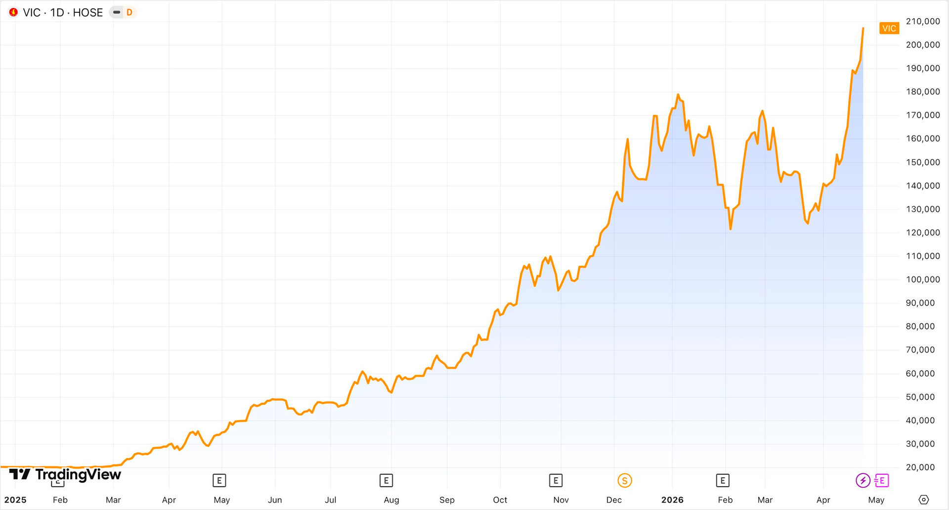 Cổ phiếu Vingroup (mã VIC) vừa có phiên tăng kịch trần đúng ngày tổ chức Đại hội đồng cổ đông thường niên 2026 (22/4). Chỉ trong khoảng 1 tháng trở lại đây, thị giá VIC đã tăng gần 70% lên mức 207.200 đồng/cp. Nếu tính xa hơn, từ đầu 2025 đến nay, cổ phiếu này đã tăng gấp 10 lần.