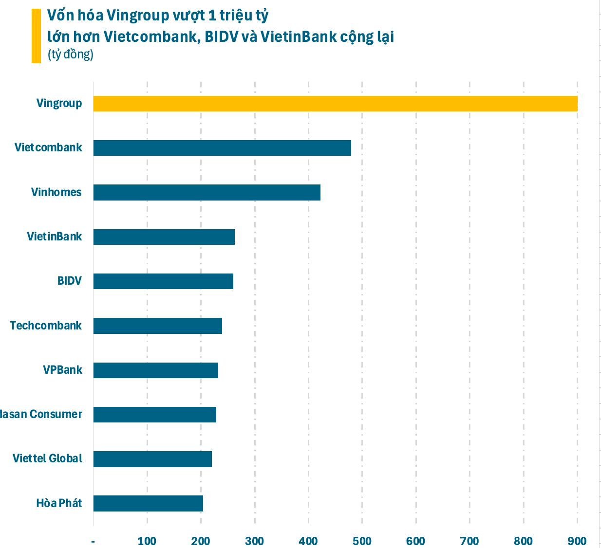 Đà tăng tốc ngoạn mục đã đưa vốn hóa Vingroup vượt mốc 1 triệu tỷ đồng, giúp tập đoàn trở thành doanh nghiệp Việt Nam đầu tiên đạt được cột mốc lịch sử này. Quy mô vốn hóa của Vingroup hiện gấp đôi Vietcombank – doanh nghiệp xếp thứ hai và thậm chí còn tương đương tổng vốn hóa của ba ngân hàng Vietcombank, BIDV và VietinBank cộng lại.