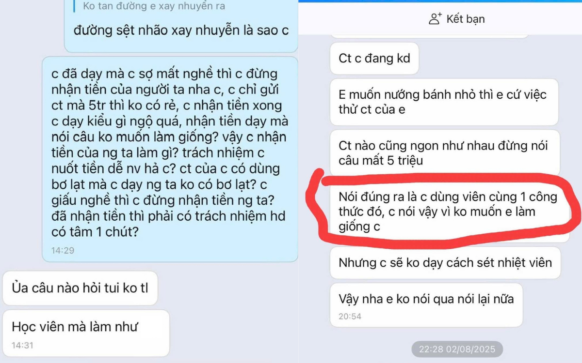 Chia sẻ cụ thể hơn, M. cho hay cô vốn có rất nhiều học viên đăng ký và tất cả đều được trao đổi trước về quy trình học. “Thông thường, sau khi nhận học phí mình đều gửi luôn công thức cho các bạn học viên. Các bạn có thể làm theo và nếu không hiểu ở đâu cứ nhắn tin mình đều giải đáp. Ngoài ra, mình cũng sẽ chỉ tận tình qua video cho các bạn. Tuy nhiên với sự việc vừa qua sau khi gửi công thức, hai bên có xảy ra mâu thuẫn, không hiểu nhau trong cách nói chuyện nên mình chưa thể tiếp tục thực hiện các bước còn lại trong quy trình”, M. nói.