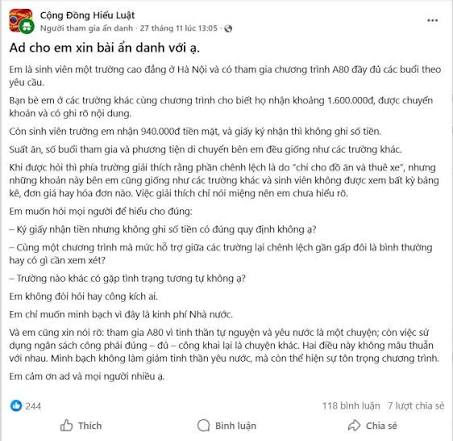 Trước đó, trên mạng xã hội, một số sinh viên đặt vấn đề tính hợp lệ của việc ký nhận mà không ghi rõ số tiền, cũng như thắc mắc vì sao cùng phục vụ chương trình A80 nhưng mức chi giữa các đơn vị lại vênh nhau đáng kể.
