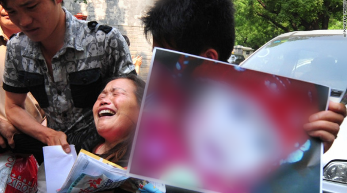 Người thân cầm theo di ảnh bé gái tử vong do ngộ độc sữa nhiễm melamine đến tòa án - Ảnh: CNN